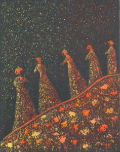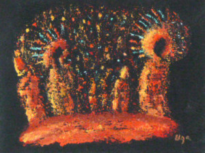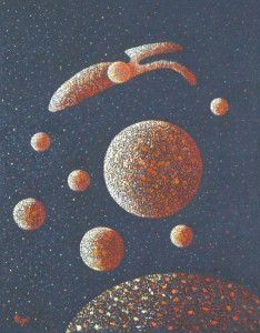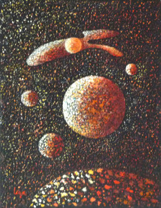 Particularité du mouvement: ce mouvement distinctif sur fond sombre, généralement noir, est un dérivé du pointillisme. Les points forment la texture et les éléments picturaux de l’oeuvre travaillée au couteau (spatule). L’univers est souvent cosmique. On y rencontre aussi des personnages qui se rassemblent. Le style naïf des personnages est teinté de sobriété. Quelques points de couleurs ponctuent parfois l’ensemble du fond texturé. Des éléments abstraits peuvent être le centre du sujet tout en conservant ce fond sombre texturé de petits pointillés.